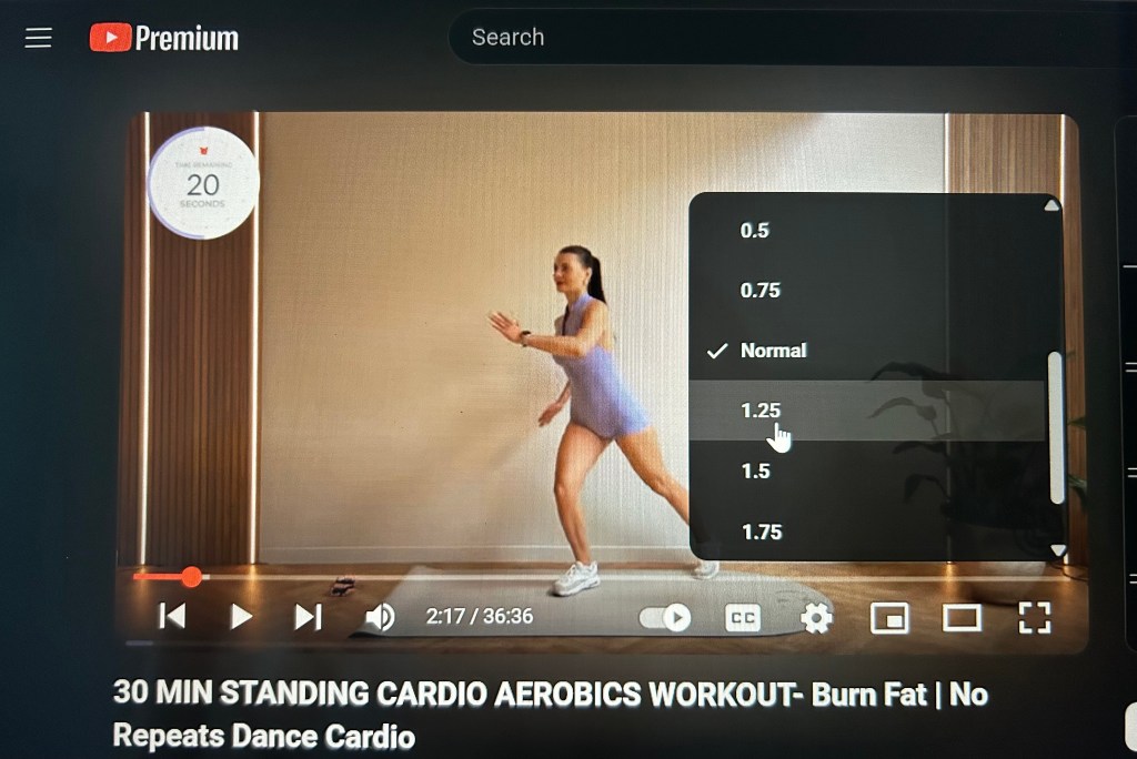 - Change the speed. Sometimes a workout may feel too slow or too fast. Did you know in the Settings you can change the playback speed from the default “normal” to 1.5x, 2x for a faster tempo, or 0.75, 0.5 to slow it down? You can even customize the speed more specifically to something like 1.05 (not sure who would need that but it’s still a nice feature!). I tried this with a walking workout where I wanted a little more intensity, and it felt great. Another plus is that you finish the workout a little faster. This could change a 45-minute video to 30-35, depending on the speed, in case you’re trying to fit in a lunch workout OR you could tack on a different 5-10 minute ab workout with the time saved.